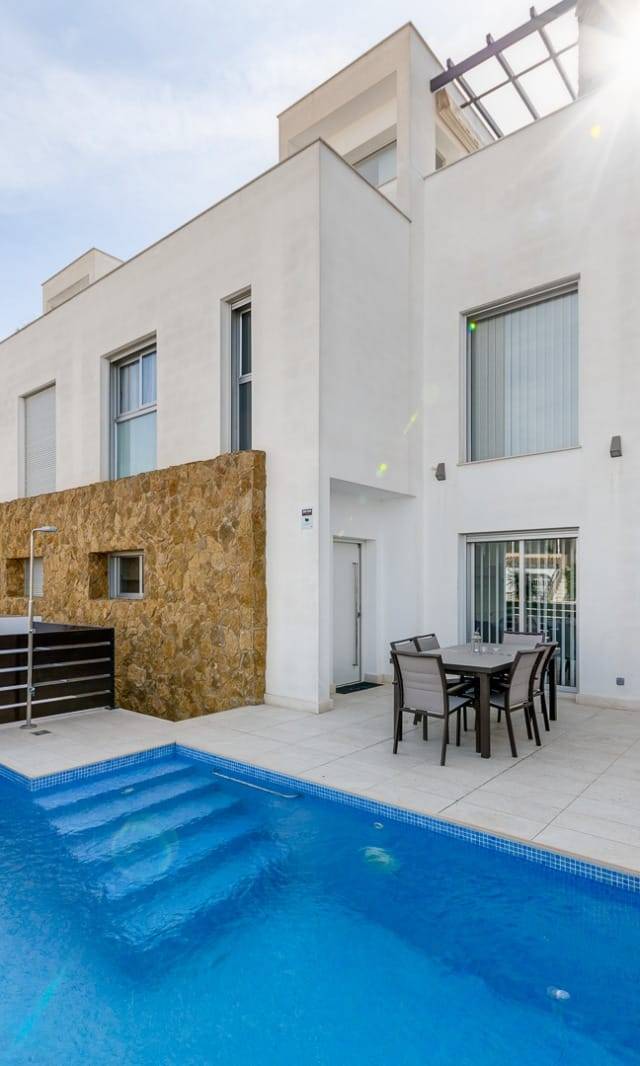 FANTASTIC HOUSE WITH PRIVATE POOL, ROSALEDA, TORREVIEJA A warm welcome to this modern home with a fantastic amount of light in the middle of the popular area Rosaleda.~On the ground floor we find an open living room, a complete bathroom with shower, a fantastic kitchen with top-class white goods and a garden with a wonderful private pool.~On the first floor in the house we find two airy bedrooms and a complete bathroom, also with a shower.~This house has a basement where we find a bedroom with a private patio, a large living room and a storage room.~At the highest floor of the house, you can enjoy lovely evenings on the private roof terrace.~Welcome to contact us for a visit!