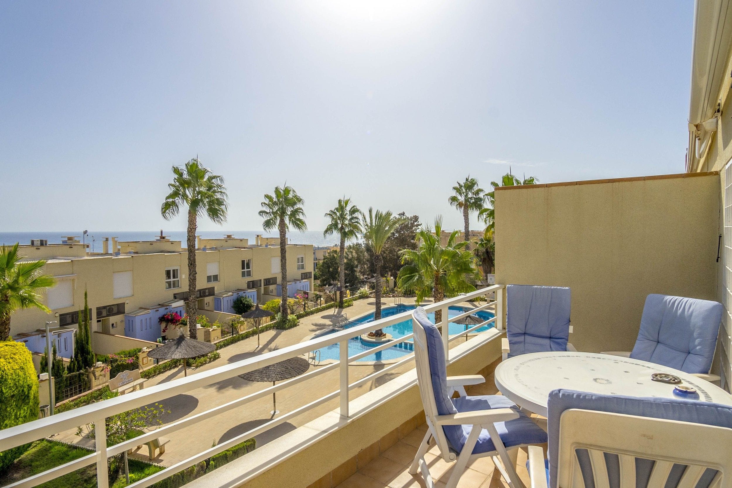 TOP FLOOR APARTMENT WITH SEA VIEW IN AGUAMARINA. Top floor apartment with magnificent views of the sea, located in the prestigious urbanization of Terrazas de Aguamarina, with an excellent location 200 meters from the sea and very close to the main services of the municipality, supermarkets, restaurants, pharmacy, shopping center. With the surface of 64 m 2, it consists of 2 bedrooms and 1 bathroom, equipped kitchen. Solarium 55m2 with sea views and storage room 6.5m2. The price includes a parking space in the underground garage. Residential with community pool and green areas. The house in very good condition, very bright, east facing. Contact us for more information!