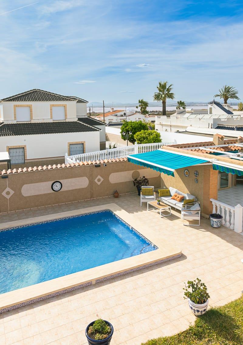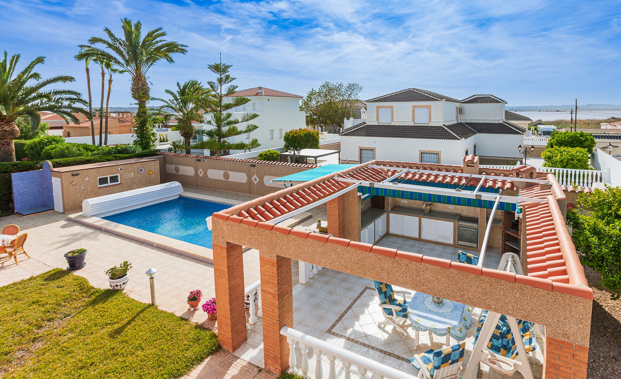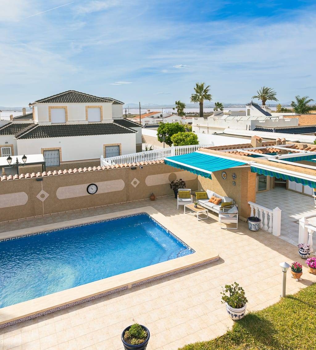 Amazing villa with private pool and stunning views. Introducing your dream home with fantastic views of the red salt lake, nestled in a serene private residential area. This spectacular property combines luxury living with spaces for work and family gatherings. With two levels, the upper floor offers complete privacy with a separate entrance, ideal for multigenerational living or accommodating guests. The big garden features a covered swimming pool and a large terrace with a summer kitchen, providing the perfect setting for entertaining guests regardless of the weather. Seize the opportunity and make your dreams come true. Contact us for more information!