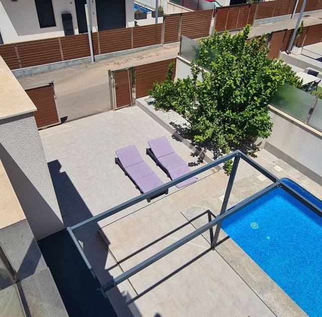 3 storey villa with private roof terrace and pool A warm welcome to this fantastic villa with pool and space for the large family. The property has 6 bedrooms, 3 bathrooms, living room, kitchen, basement and a wonderful garden. The house is located in a popular area with proximity to grocery stores and restaurants with sun all day. Various specifications: