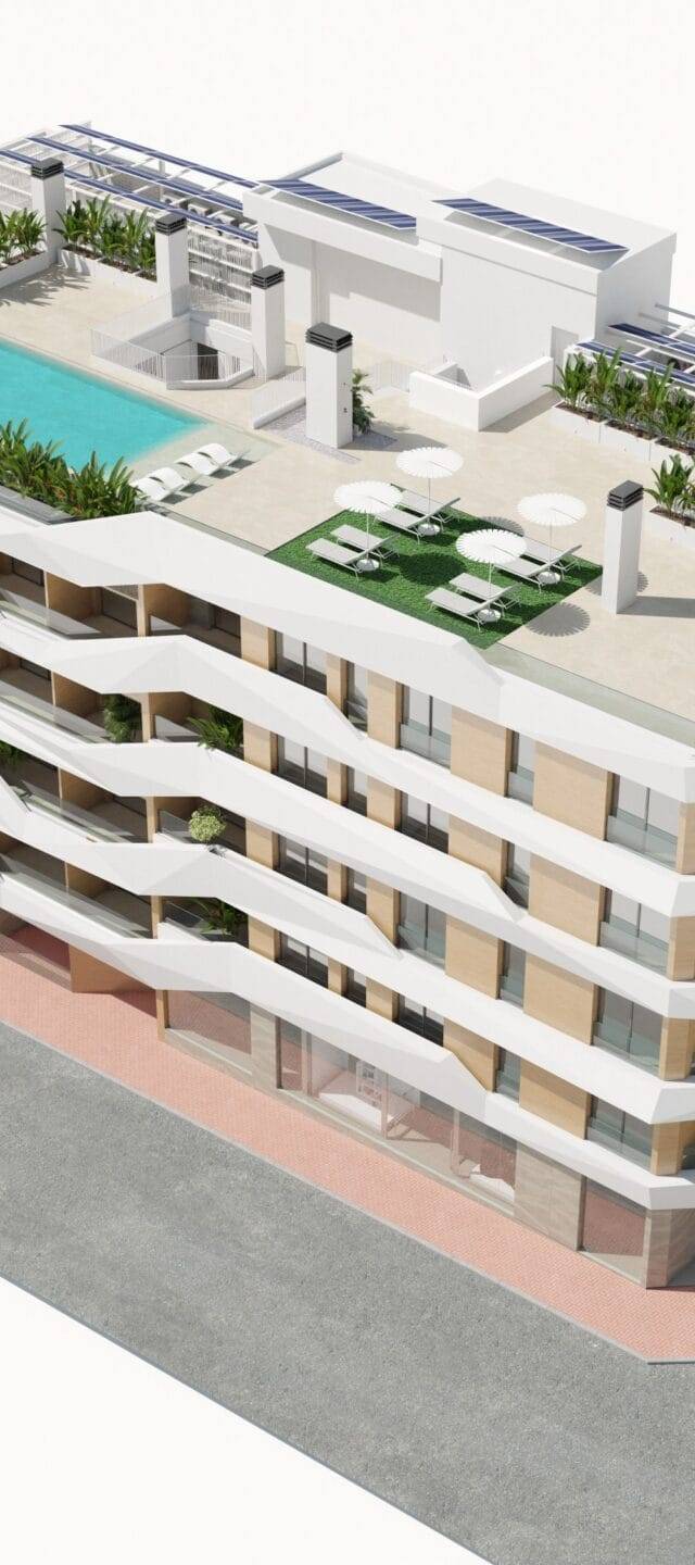 Apartments 100 m. from the beach in Guardamar del Segura. The development comprises 44 apartments, with 1-3 bedrooms and 1-2 bathrooms, living-dining room and integrated kitchen. The building will have a communal swimming pool and solarium on the roof. Parking spaces and storage rooms available.