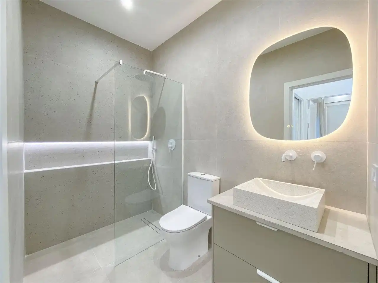 At the entrance there is a pleasant northwest-facing terrace of 25m², perfect for enjoying the afternoon sun and warm Mediterranean evenings. One of the bedrooms also has access to a private patio with a washing machine area.