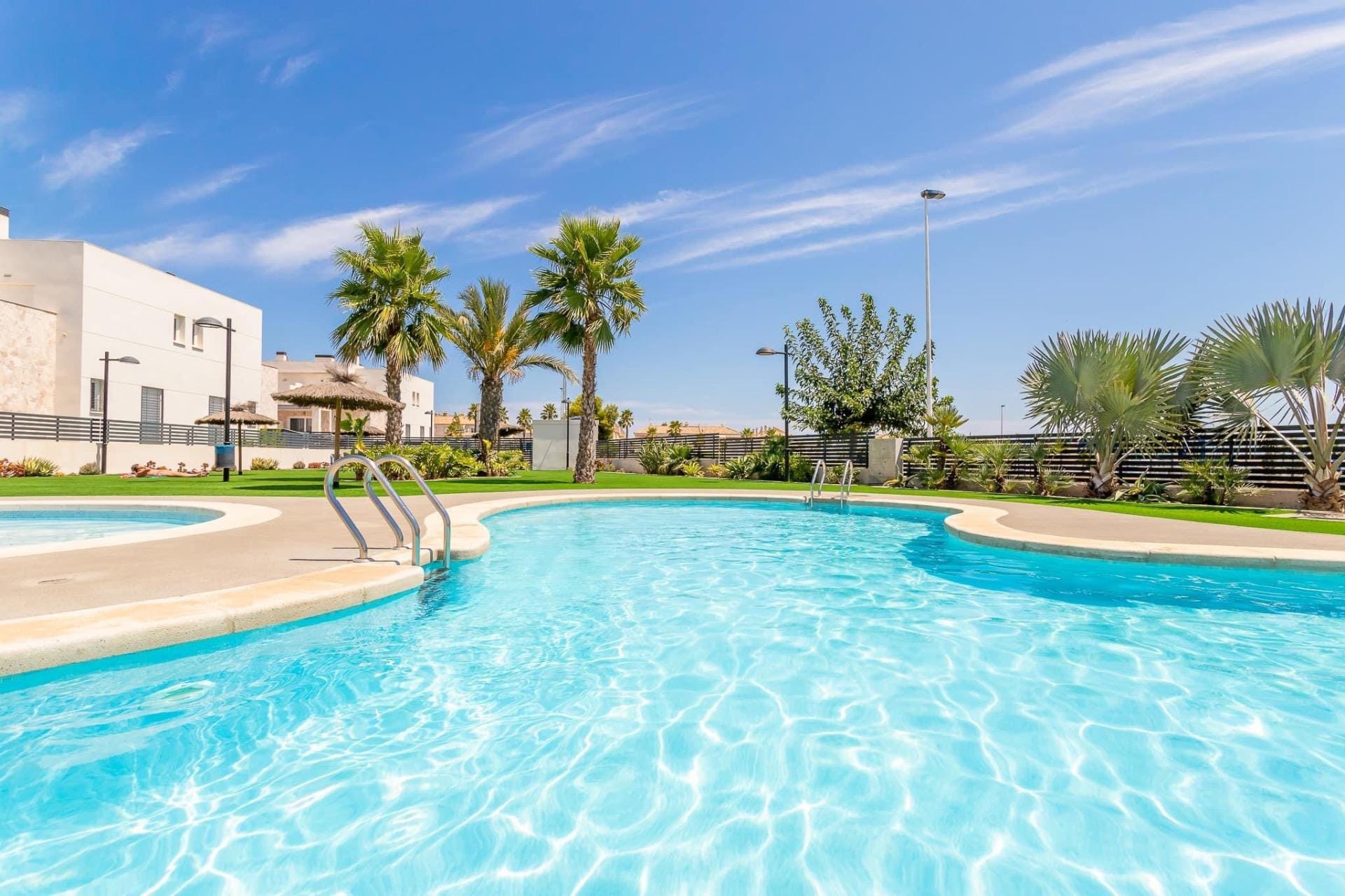 Fantastic corner quad villa with large garden in Torrevieja. Fantastic corner quad villa with large garden located in Aguas Nuevas, Torrevieja. This quad villa with 3 bedrooms and 3 bathrooms was built in 2020 and is in semi-new condition. It stands out for its corner location and a large garden with terrace areas to enjoy the sun. Inside, it has a spacious living/dining area, a fully equipped modern kitchen, as well as an en-suite bedroom on the ground floor. Upstairs there are two further bedrooms, both with ensuite bathrooms. Contact us for more information!
