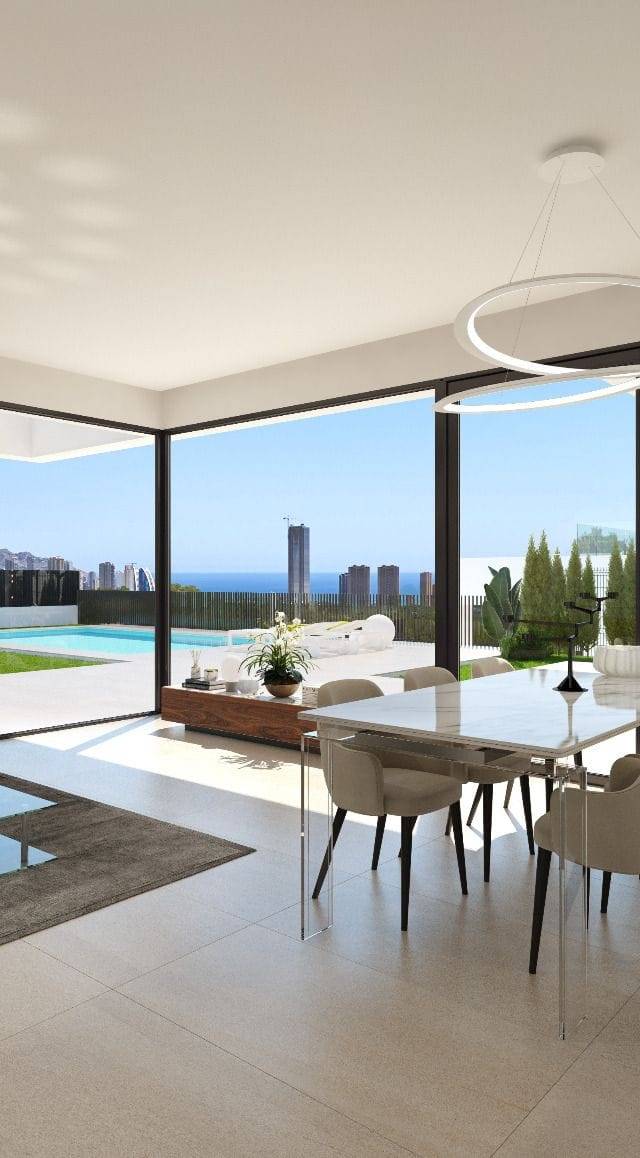 New villas for sale in Finestrat, Costa Blanca North, Spain. Prices: 625.000€ - 1.350.000€ Plot sizes: 501m² - 861m² Contact us at Collected Homes for more information & floor plans. The villas are located in the Benidorm / Sierra Cortina area, in the SEAVIEW 4 residential complex. It's 3 kilometers from the beach and it has sea views. The property faces south. It has a built area of 142 m2, a plot area of 501 m2, and a terrace area of 65 m2. The house has 3 bedrooms, 3 bathrooms, living - dining room, kitchen, and a pantry. It has double glazing in windows, a home automation system, and an alarm system.