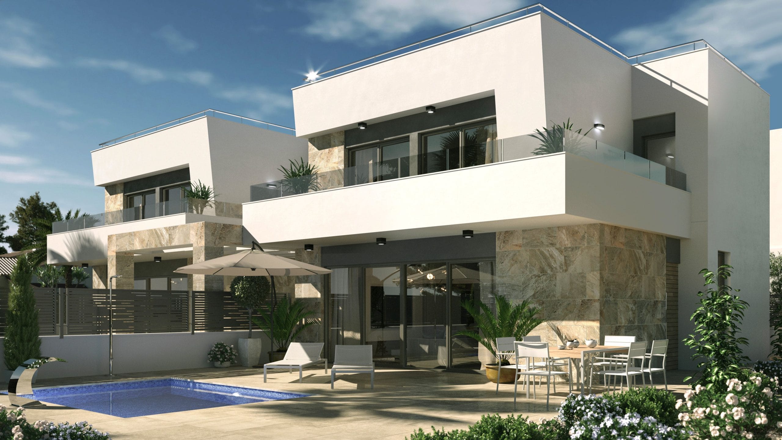 NEW MODERN DETACHED VILLAS WITH PRIVATE POOL IN VILLAMARTÍN. Each villa has an independent plot, parking space, open solarium and a possibility for a swimming pool.The properties are designed with high quality materials, using modern building technologies, both in decoration and in installation all the systems at home.All the properties have pre-installed air conditioning, heating and aerothermal, CCTV and home automation system.The plot ́s area is between 180,42 and 211,92 m² and each villa has interior area from 81,18 m² to 131,35 m². All villas has three bedrooms, three bathrooms a living room with an open kitchen. But all villas has a possibility for five bedrooms and 4 bathrooms in total.