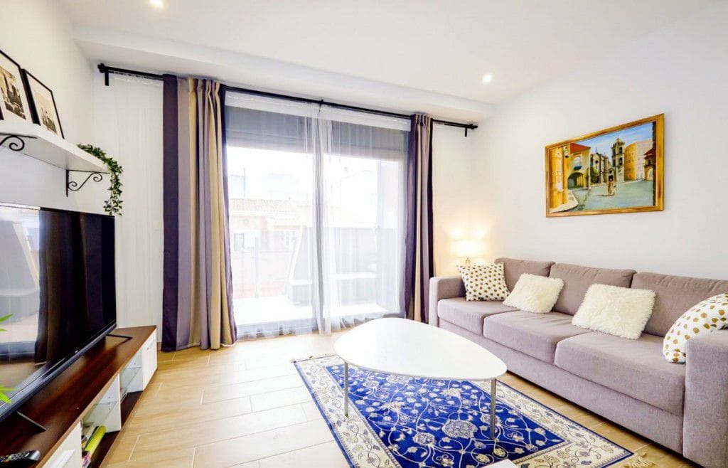 Spacious apartment for long-term living and renting out in Torrevieja C! 2 bedroom apartment with touristic license in the new building of 2020 Residencial Alegria X in Torrevieja. It has a total area of 94 m2, consists of 1 living room, 2 bedrooms, an american kitchen style, 2 bathrooms and a balcony. The apartment is being sold furnished and equipped with a kitchen. Central air conditioning. The house has a swimming pool, playground and Finnish sauna.