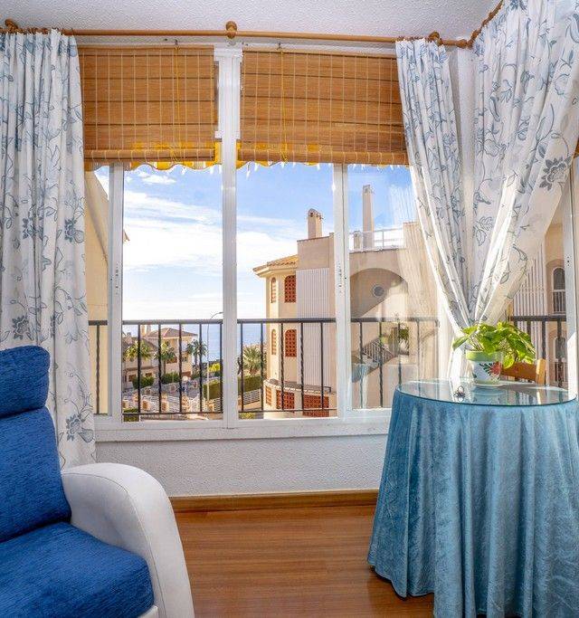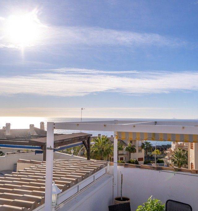 TOP FLOOR BUNGALOW WITH LARGE SOLARIUM AND SEA VIEWS 100M FROM THE BEACH IN CABO ROIG Beautiful top floor bungalow located in the Aguamarina area with fantastic views of the sea, oriented towards the southeast and with a large 45m² solarium. With 47m², it consists of 2 bedrooms and a bathroom. The house in very good condition is sold furnished and the kitchen is equipped.