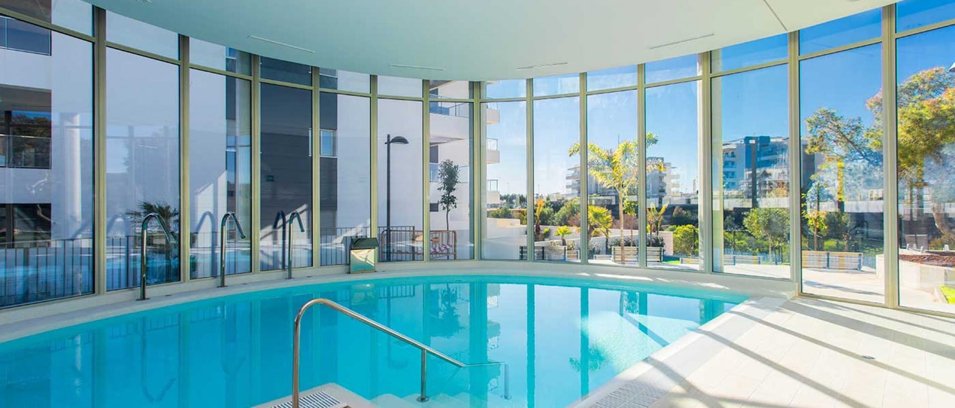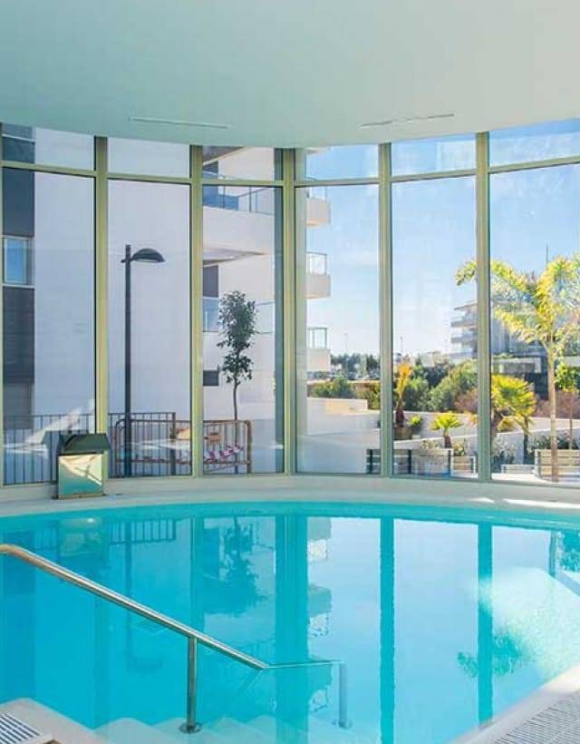 The communal areas include well maintained green areas, two large outdoor swimming pools and an indoor heated swimming pool with sauna.