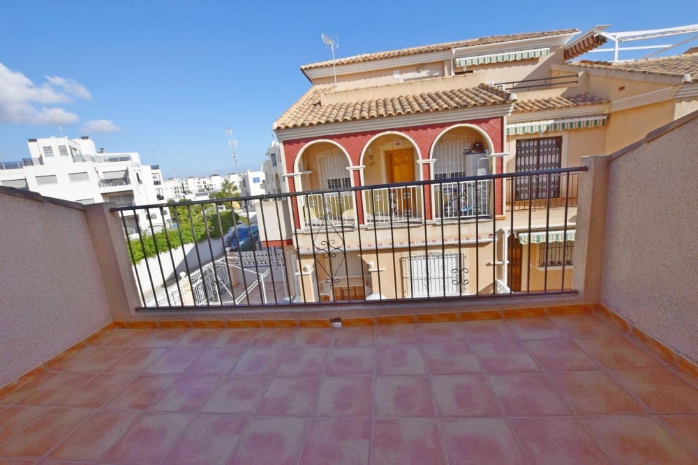 3 BED CORNER TOWNHOUSE WITH GARDEN AND SOLARIUM WALKING FROM LA ZENIA BEACH Corner townhouse located in a quiet residential area, walking to all kinds of services, such as Bus Stop, Zenia Boulevard Shopping Center, Mercadona, McDonalds, ... 600 m from La Zenia Beach and 2 km from the Golf Courses from Orihuela Costa. The house has 2 floors with a corner garden of more than 100 m², porch, large living room, bathroom, kitchen, gallery, double bedroom on the ground floor. 2 double bedrooms with Solarium Terrace and Full Bathroom on the First Floor and Solarium on the Upper Floor. Furnished, Community Pool. Good investment.