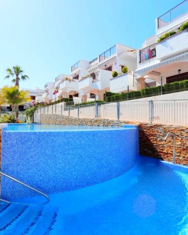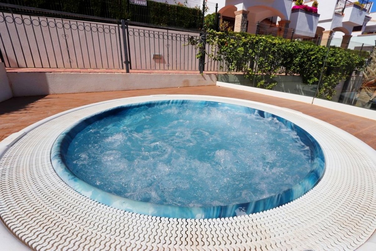 BUNGALOW GROUND FLOOR 50M FROM THE BEACH IN RESIDENCIAL AZUL BEACH Luxurious ground floor bungalow with 55m² surface: 2 bedrooms, 1 bathroom, lounge-comedór, kitchen with laundry, terrace and 45m² garden. Sold with furniture, appliances, Central A/C, storage room and parking. Residential complex account with garden, a children's pool, playground, heated jacuzzi, sauna and 2 community pools. Southeast facing and sea view.