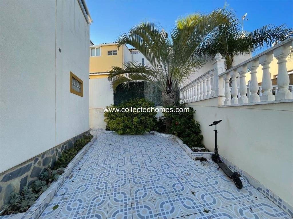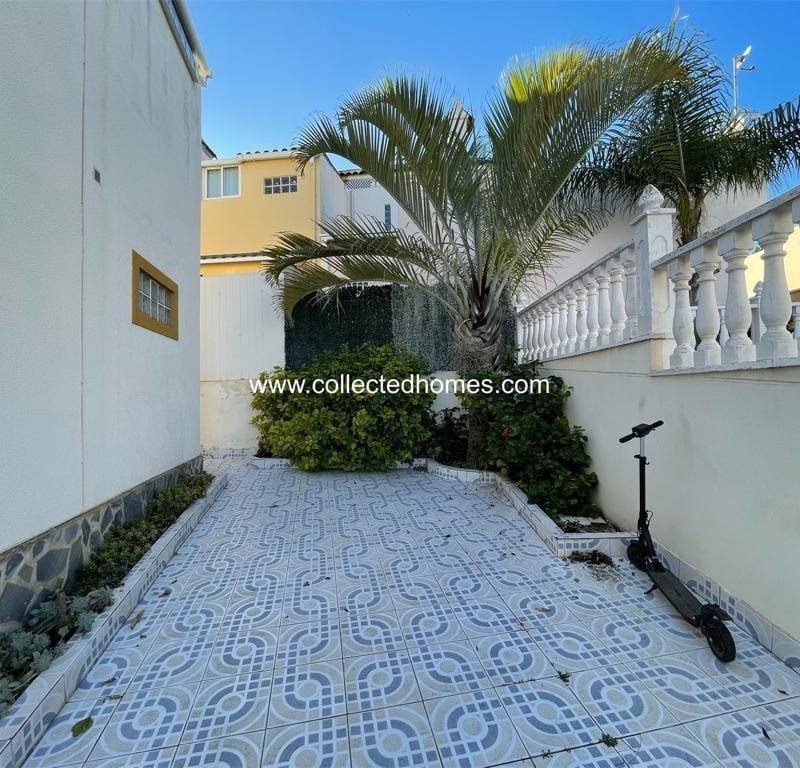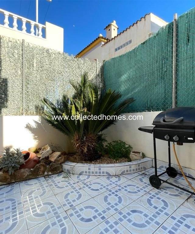Collected Homes in exclusivity presents this lovely detached house in the popular urbanization El Mirador, Los Balcones in Torrevieja. From the entrance you have access to private parking that fills 2 cars, you can walk around the house and at the back you will also find a large patio with it´s own entrance to the house through the laundry room. The patio at the front is glazed where you can enjoy your morning coffee in winter and also great place to store things. You enter the house through the open plan living room to the kitchen and laundry room, on the ground floor you will find 2 bedrooms and 1 bathroom. On the upper level you will find 1 bedroom, 1 bathroom and 1 more living room which leads you to the lovely private roof terrace where you can enjoy the sun all day with sea views. The house is also equipped with solar-powered ventilation fans in all rooms. Communal pool you will find just a short walk from the house and the beach about 2 km away!