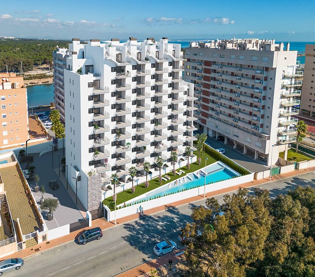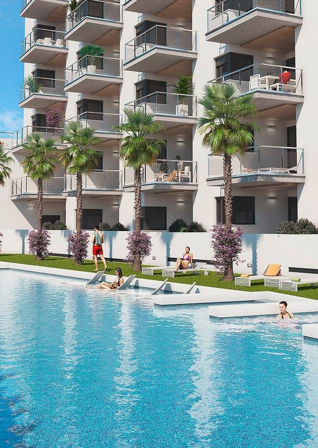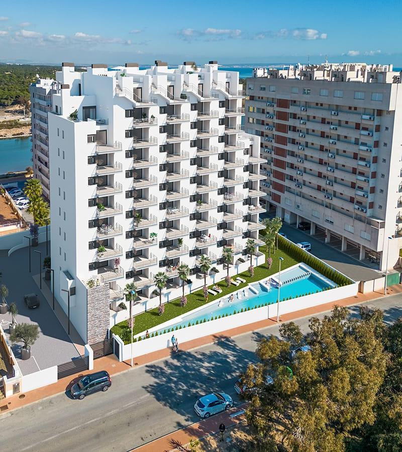 The building composed of nine floors with a total of 60 apartments of 2 and 3 bedrooms. The complex has large common garden areas and communal pool, parking on the basement floor and storage rooms included in the price. The residential is located a step away from the marina and 500 meters from the beach of "Los Viveros".