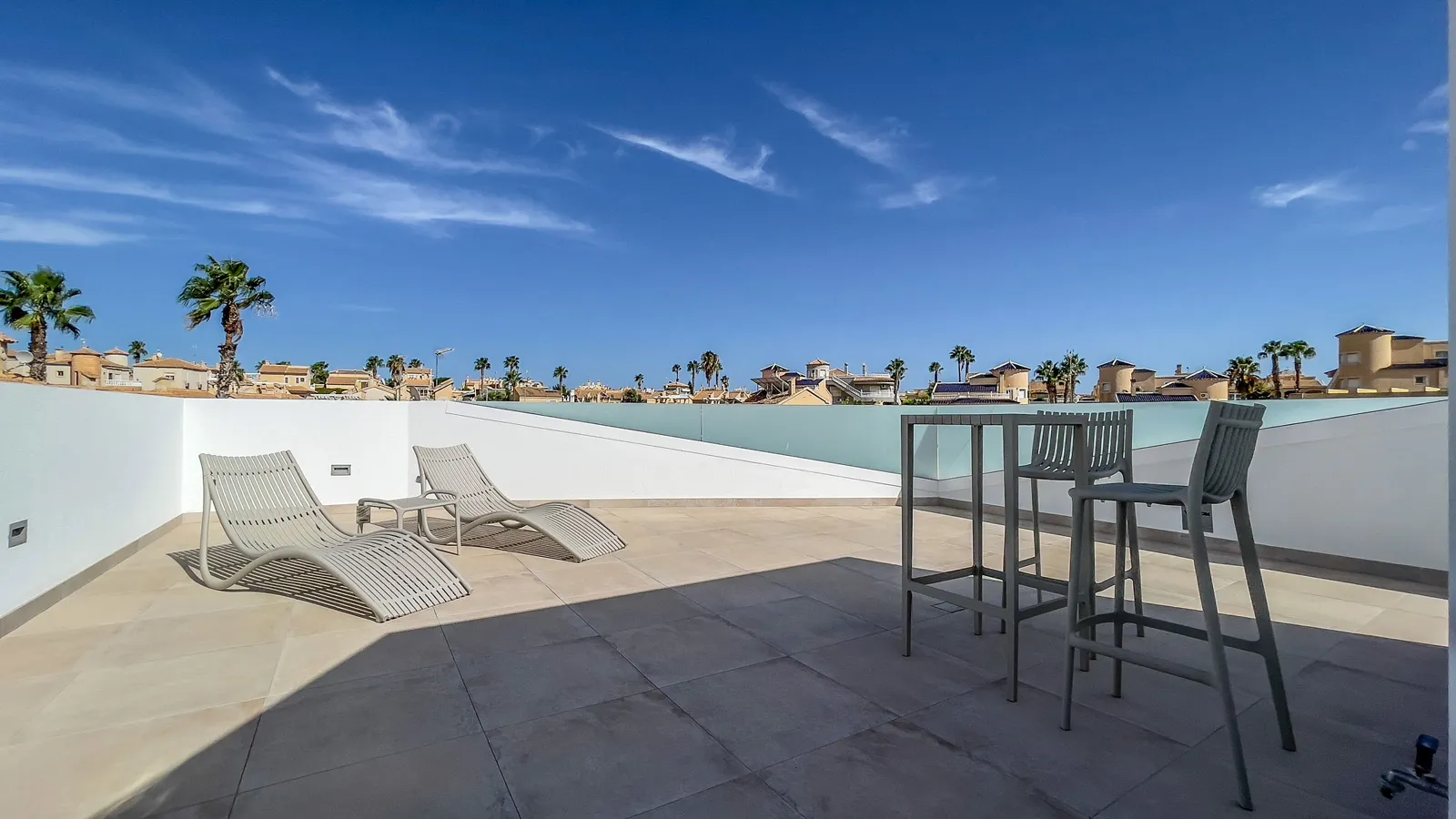 The Le Mans residential complex is made up of semi-detached villas. Each property is built on one floor and solarium. There are 3 bedrooms (2 en suite), 3 bathrooms, living room, kitchen open to the living room with large windows and access to a large semi-covered terrace and pool.