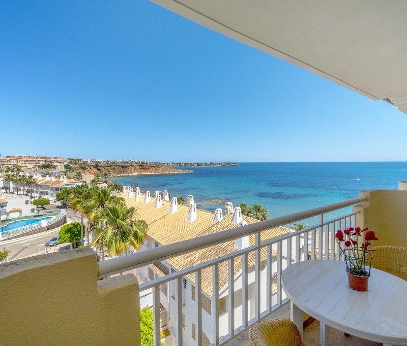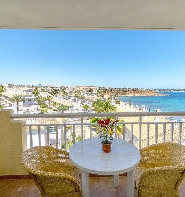 SEA FRONT APARTMENT IN CAMPOAMOR. Sea front apartment in Dehesa de Campoamor. Third floor, northeast orientation. Newly renovated apartment with the área of 44m2, has a large bedroom, bathroom, American kitchen, living room and a large terrace with panoramic views of the sea. A / C in the living room. The residential is located just above the Aguamarina and Campoamor beaches, with relaxation areas, a communal pool and direct private access to the beach. The apartment has a parking space included in the price.