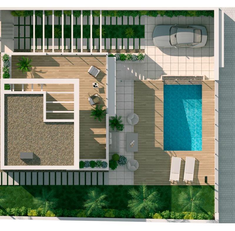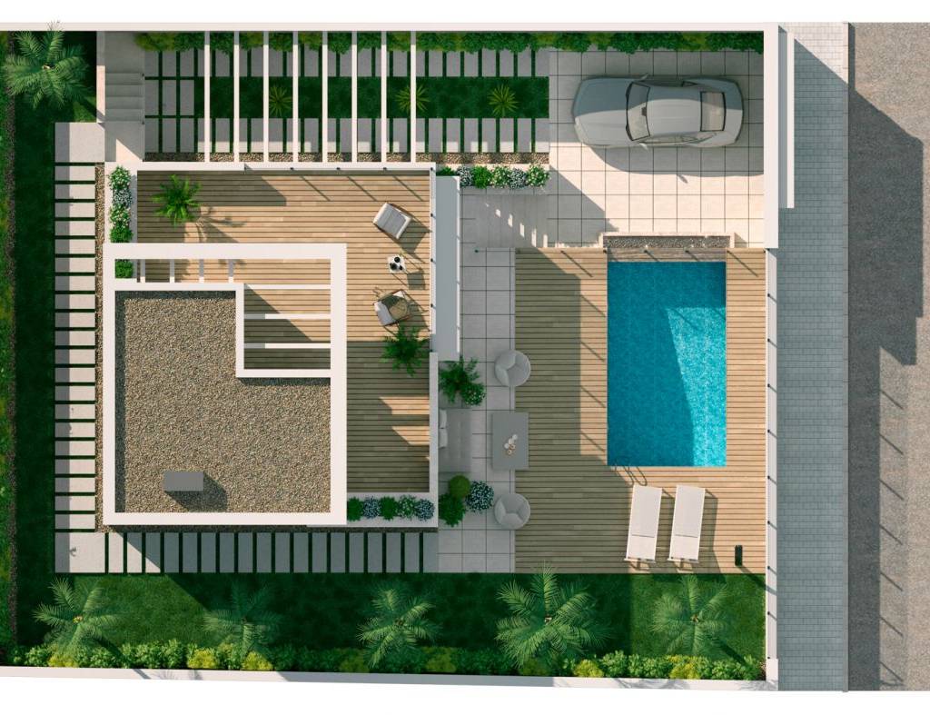 The plot area is 300 sqmt. The villa has a total area of 236,92 sqmt divided into three bedrooms (two bedrooms more can be optional at basement floor), two bathrooms, living room, open kitchen and living room, as well as a total area of terraces on the strees, balconies and a terrace on the upper floor with beautiful views of the sea, green areas and Laguna de La Mata of more than 90,68 sqmt. There is also a possibility of building without a basement. In this case, the surface area of the house is 161,72 sqmt.