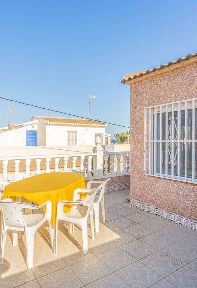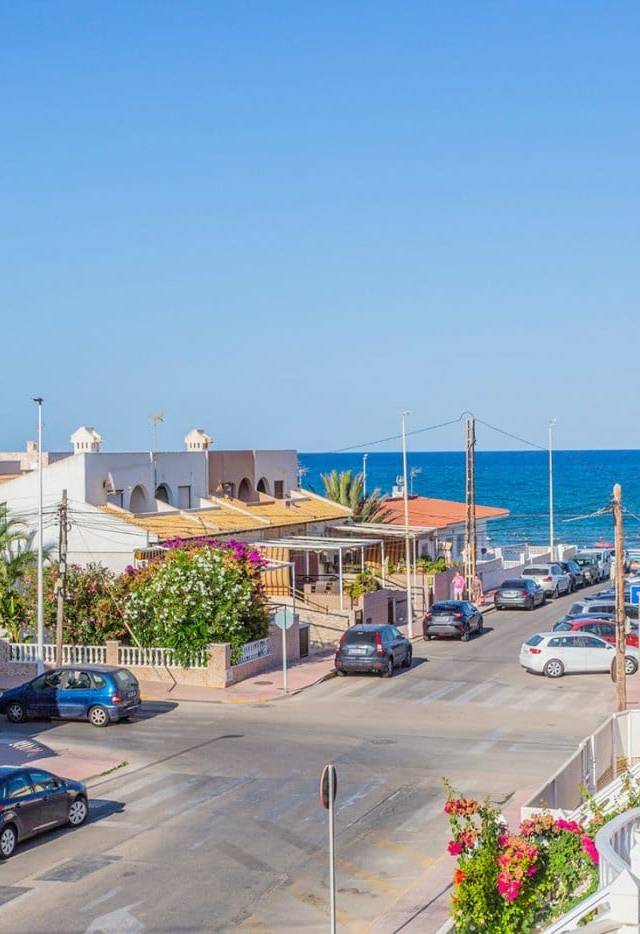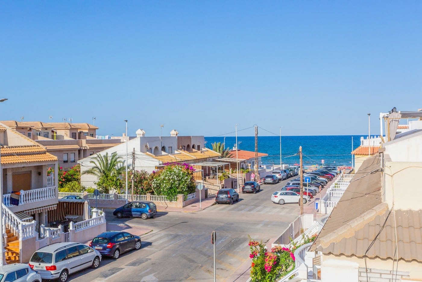 Impressive townhouse with sea views in La Mata with garage included. This fantastic home is located in one of the best areas of Torrevieja; The Kill. Just 50 meters from the water, this corner townhouse triplex has three bedrooms and two bathrooms, as well as a large terrace at the entrance on the ground floor and a solarium with sea views. On the third floor, before going out to the solarium, there is another multipurpose area with a sofa bed. The house has air conditioning and is sold fully furnished and equipped. The separate kitchen is located on the lower floor and is in very good condition. The terrace has a nice garden area around it that gives it privacy and makes it even more beautiful if possible. In addition, it is sold with a garage and a storage room included in the price.